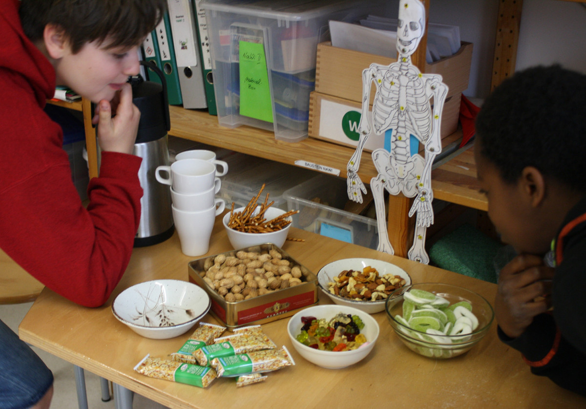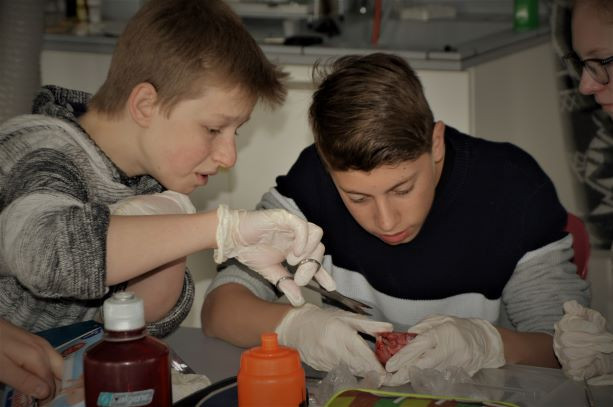Zu den begeistert sportlich Aktiven gehörten heute auch die Teilnehmenden des Workshops »Anatomie«. Dieser hatte noch ein besonderes Highlight: Frau Naumann brachte verschiedenste Organe und Knochen von Tieren mit, welche mit Händen und Mikroskopen untersucht wurden.