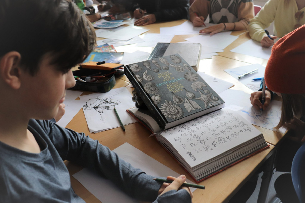 Der erste, ereignisreiche Tag begann mit einer kleinen Vollversammlung. Alle Schüler_innen sammelten sich in der Aula und sahen mit staunenden Augen das Eröffnungsvideo von Frau Kaßner. Danach hielt Herr Böhme eine aufschlussreiche Rede und drückte als erster seinen Daumenabdruck auf ein Bild von Leonardo Da Vinci, gezeichnet von Benno aus Stammgruppe I. Dieses soll sich im Laufe der Woche durch die Fingerabdrücke aller Teilnehmer_innen zu einem individuellen Kunstwerk entwickeln. Im Anschluss konnten die Workshops starten.