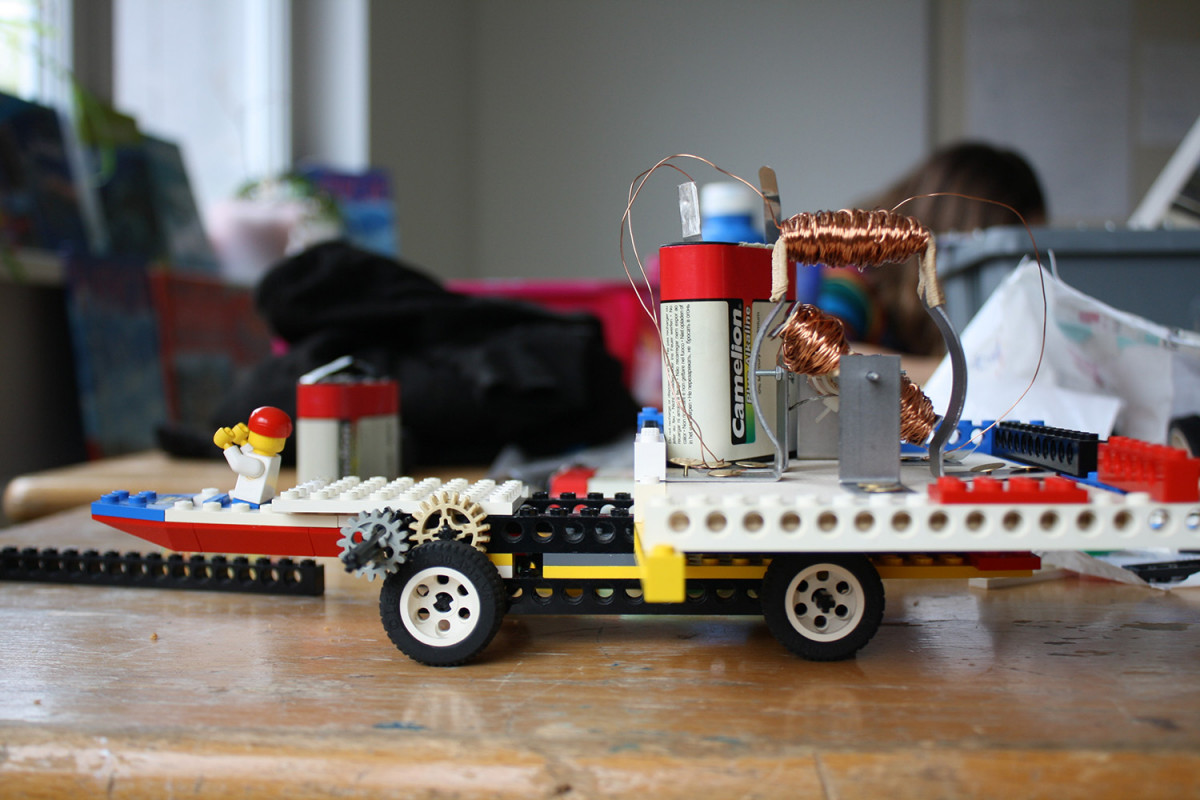 Gestern konstruierten Etienne und Josef im Workshop »Alternative Antriebe bauen« einen Gleichstrommotor. Dieser wurde im Laufe des Tages mit eigenen mitgebrachten Legosteinen an ein selbst gebautes Auto gebastelt, welches im Anschluss fahren sollte.