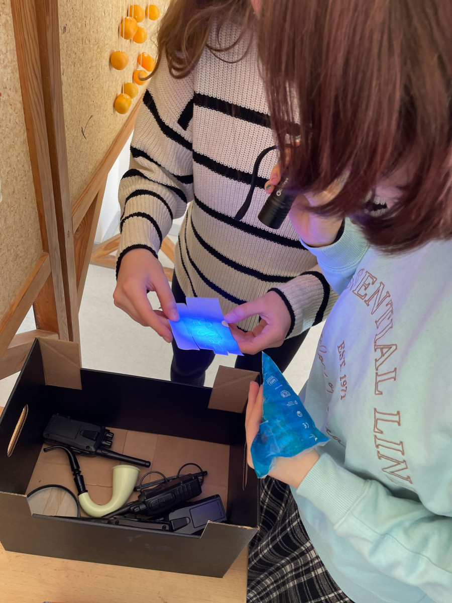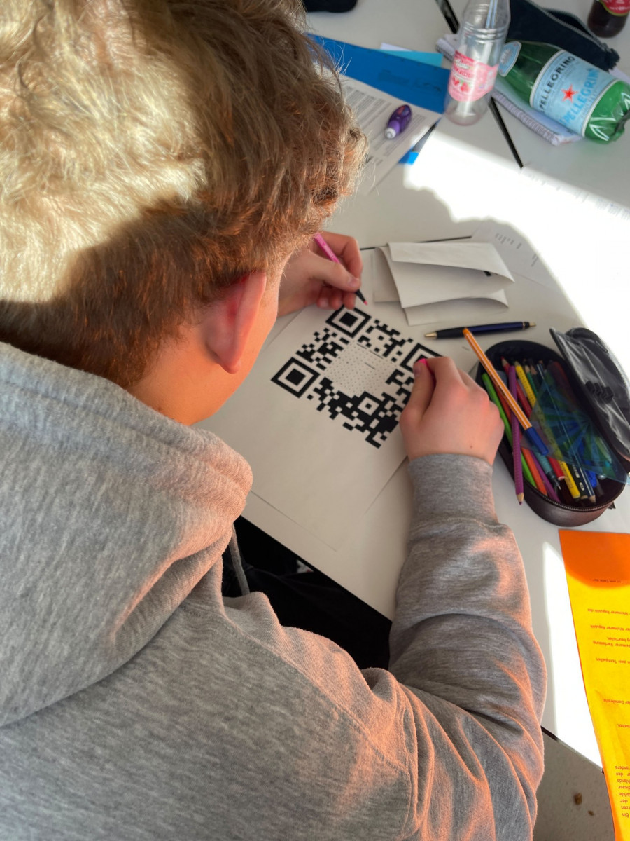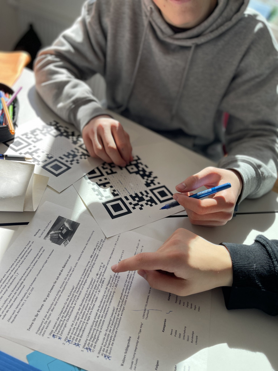 Agentenhinweise, an einer Tafel angepinnt, halfen den Teams dabei, in den nächsten Stunden alle Themen zu bearbeiten, die Dokumente zu sichten und Codes zu sammeln. Dabei hielt jedes Thema seine eigenen Herausforderungen und analoge sowie digitale Tools bereit: Beim Thema »Ruhrkrise« etwa, galt es einen QR-Code zu vervollständigen, der zu weiteren Hinweisen führte. Beim Thema Weltwirtschaftskrise kam ein UV-Licht zum Einsatz, das den gesuchten Code offenbarte, für das Thema Hitlerputsch hatten die beiden Lehrerinnen im Vorfeld ein fiktives Kneipengespräch zweier älterer Damen aufgenommen, mit dem die Schüler*innen durch genaues Zuhören das Rätsel lösen mussten, beim Thema Verfassung mussten sich die Teams durch eine non-lineare Geschichte klicken und ihr Wissen testen usw.