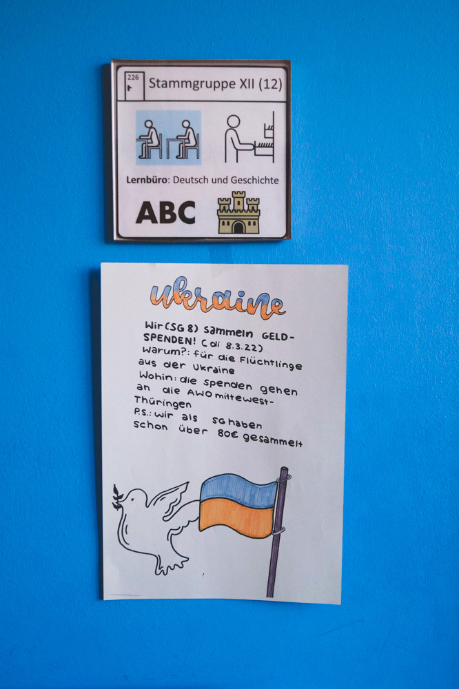 Der Krieg in der Ukraine und die dramatsiche massenafte Flucht ihrer Menschen bewegt auch unsere Schule sehr. Vier Schüler*innen der Stammgruppe 8 wollten unbedingt helfen und haben sich entschlossen, eine selbst organsierte Spendensammlung in der UniverSaale durchzuführen. Unterstützt von ihren Pädagog*innen entwarfen sie Aufrufe und warben per Schulfunk für diese Aktion. An mehreren Tagen wurde gesammelt, mit einer Sammelkiste ging es in den Pausen von Stammgruppe zu Stammgruppe, und bis heute kamen 500€ zusammen! Ein stolzes Ergebniss, über das sich die Organisator*innen Caja, Ida, Tabea und Lintje wahnsinnig freuten.