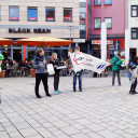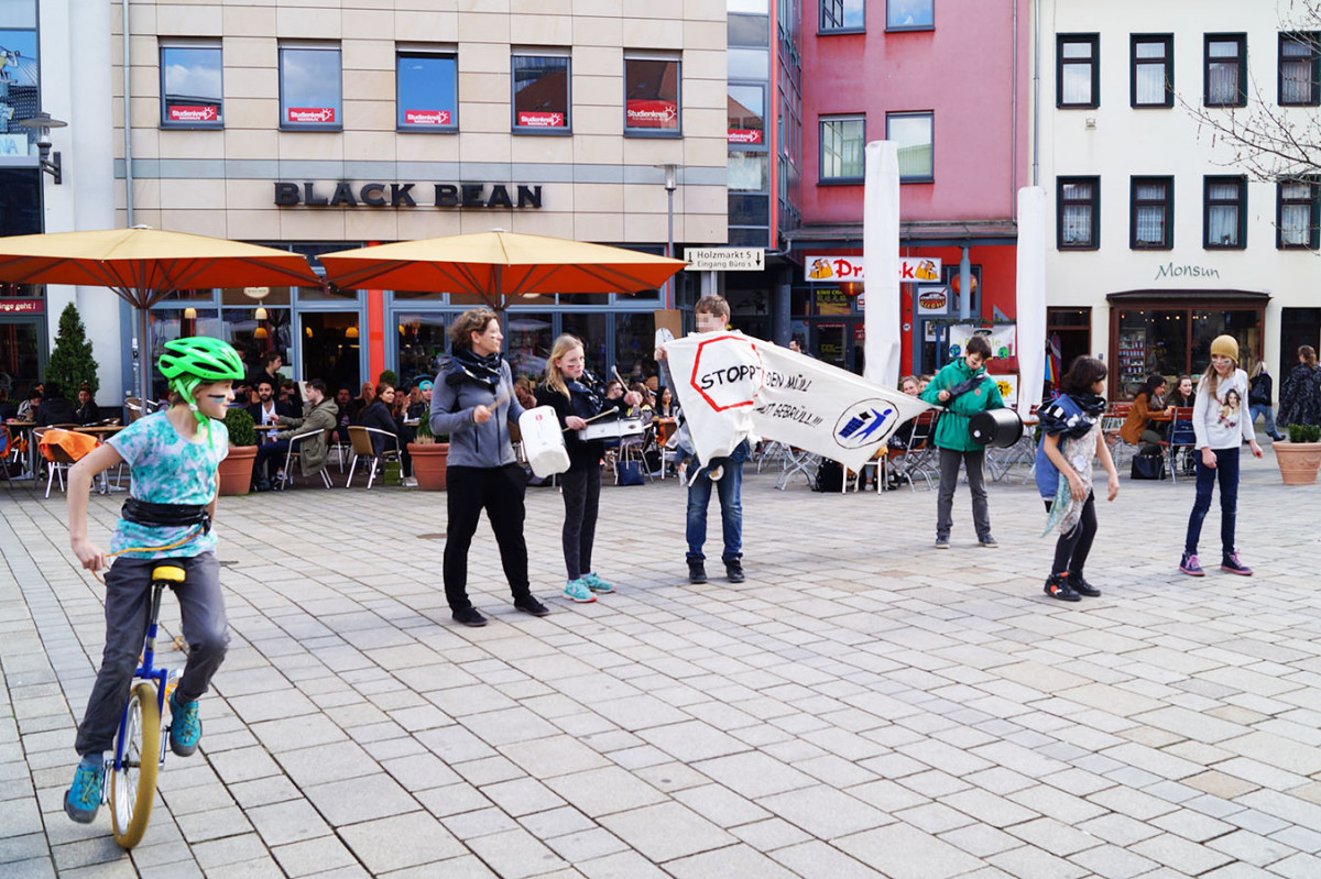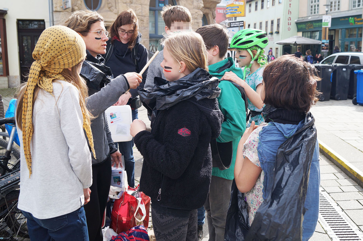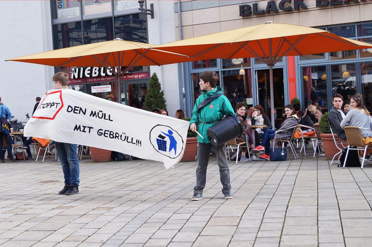 Gestern nachmittag zogen Schüler_innen der UniverSaale mit Trommeln und raselnden Dosen auf den Holzmarkt, um mit einem Flashmob auf die Saaleputz-Aktion an diesem Samstag aufmerksam zu machen. Ihr Ziel, mit einem großen Transparent und ordentlich Krach die Aufmerksamkeit auf sich zu ziehen, ist dabei aufgegangen. Nach dem “Gebrüll” wurden Flyer an die Café-Besucher_innen und Passant_innen verteilt. An diesem Samstag trifft sich die Gruppe um 10 Uhr an der Camsdorfer-Brücke, um den Saaleabschnitt entlang des Paradies-Parks vom Müll zu befreien. Da stündlich ca. 300 Tonnen Müll über die Flüsse ins Meer gelangen, an dem viele Tiere verenden, trägt diese Aktion einen kleinen Teil dazu bei, das Sterben zu verringern.