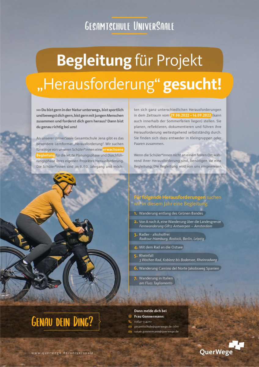 An der UniverSaale gibt es das besondere Lernformat „Herausforderung”. Wir suchen für unsere Schüler*innen erwachsende Begleiter*innen für die letzte Planungs- und Durchführungsphase ihrer eigenen Projekte.