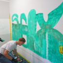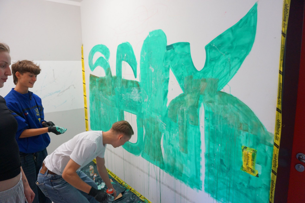 Auf Spaß fokussiert und sehr motiviert arbeiten die Teilnehmer*innen des Graffiti-Workshops an ihren individuellen Mappen und skizzieren wild drauf los. Alle bringen Lust auf Graffiti und Interesse an dieser Art der Kunst mit, das spiegelt sich in ihren Arbeiten wider. Die Gruppe wird auch auf große Leinwände sprayen oder eine Garderobe gestalten. (fe)